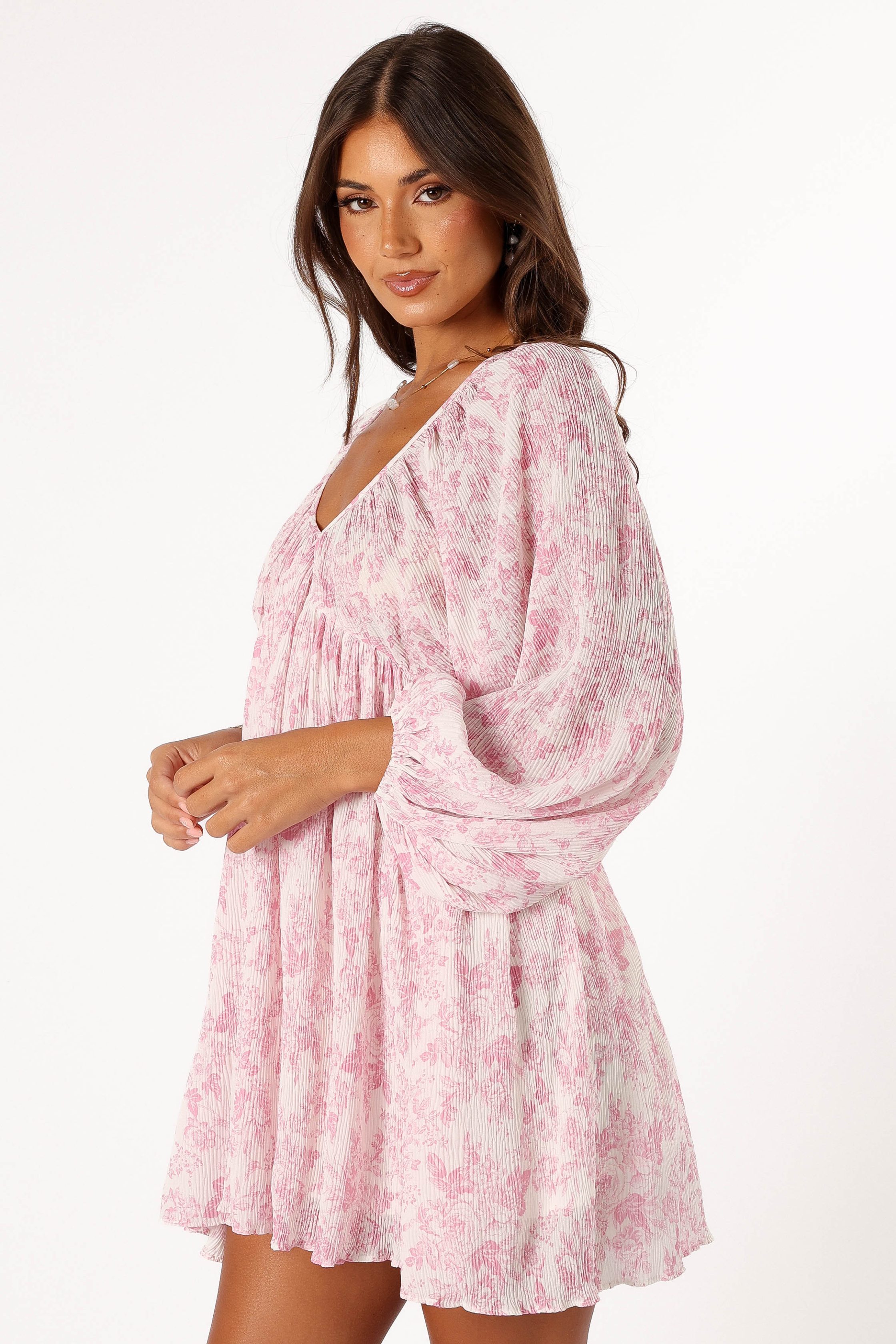 This mini-length marvel features a fun v-neckline and long sleeves with elasticised cuffs for the perfect blend of comfort and chic. The back surprises with a tasteful v and tie close detail, adding an extra dash of sass mini length v neckline long sleeves elasticised cuffs back v with tie close detail side invisible zip pink floral print plisse material partially lined material – 100% polyester lining – 100% rayon SIZING model is 5' 7" and wears a Size S model stats: bust – 31.5", waist – 25", hips – 32.5" GARMENT CARE cold hand wash separately