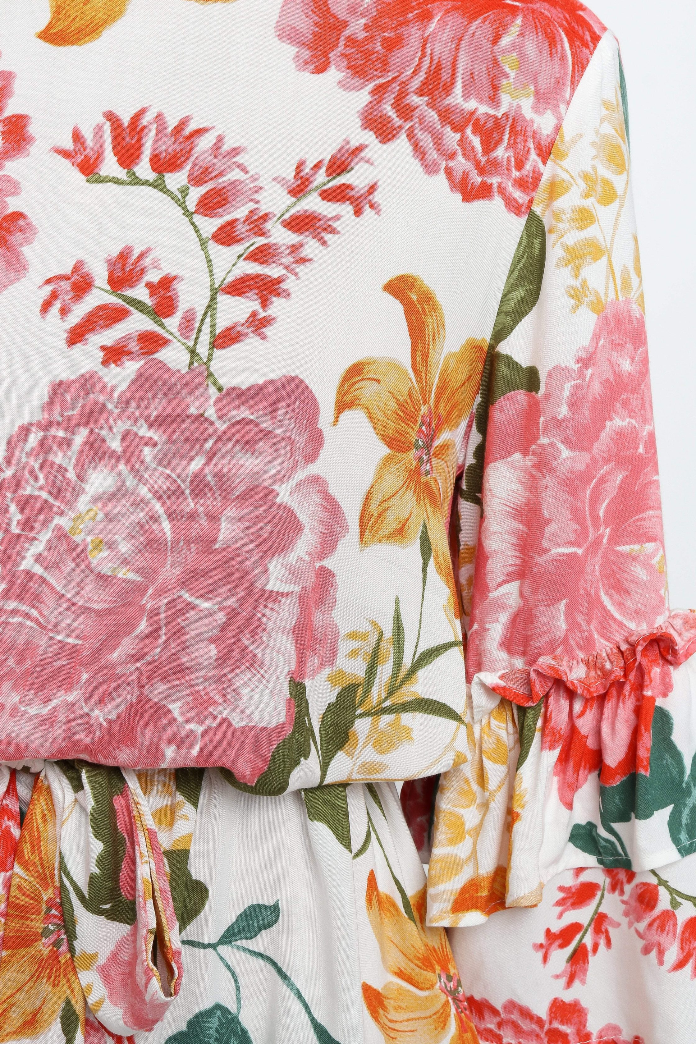 This gorgeous floral dress is perfect for any occasion! It features a round neckline, mid length sleeves with ruffles, and a detachable waist tie. The above the knee hem is finished off with a ruffle detail and invisible back zip – all in our signature fun and feminine style! above the knee length mid length sleeves with ruffles round neckline detachable waist tie ruffle hem invisible back zip floral print unlined material – 100% rayon SIZING model is 5' 6" and wears a Size S model stats: bust – 30", waist – 22.5", hips – 36" GARMENT CARE cold hand wash only