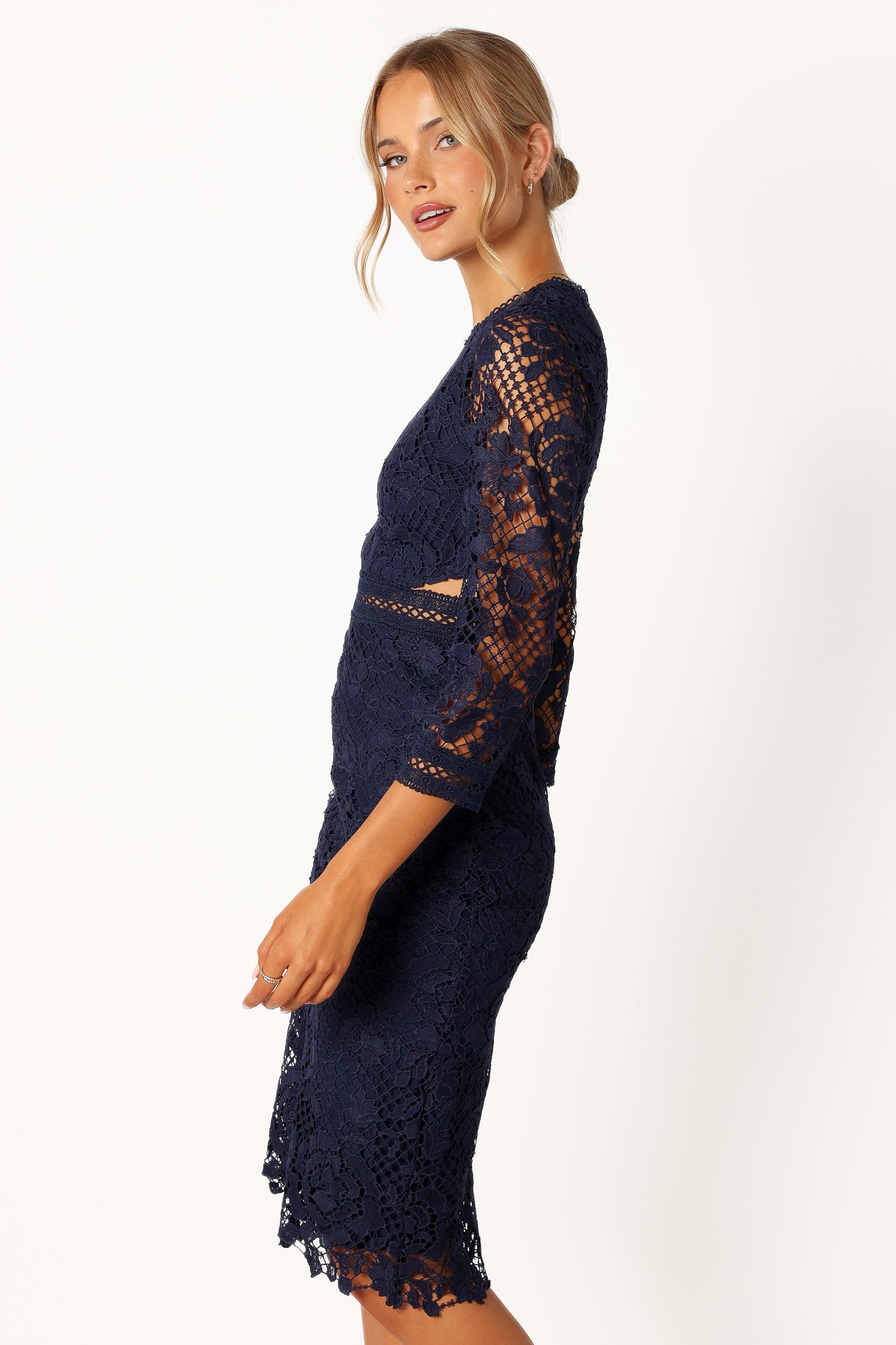 Calling all party-goers! Perfect for special occasions and events, this midi length dress is sure to turn heads. Its timeless design featuring a lace overlay and high round neckline will make you stand out from the crowd. midi length long sleeve length lace overlay feature high round neckline back invisible zip side cut out details ruffle hemline lined material – 100% polyester SIZING model is 5' 8" and wears a Size S model stats: bust – 30.5", waist – 24", hips – 36.5" GARMENT CARE cold hand wash separately