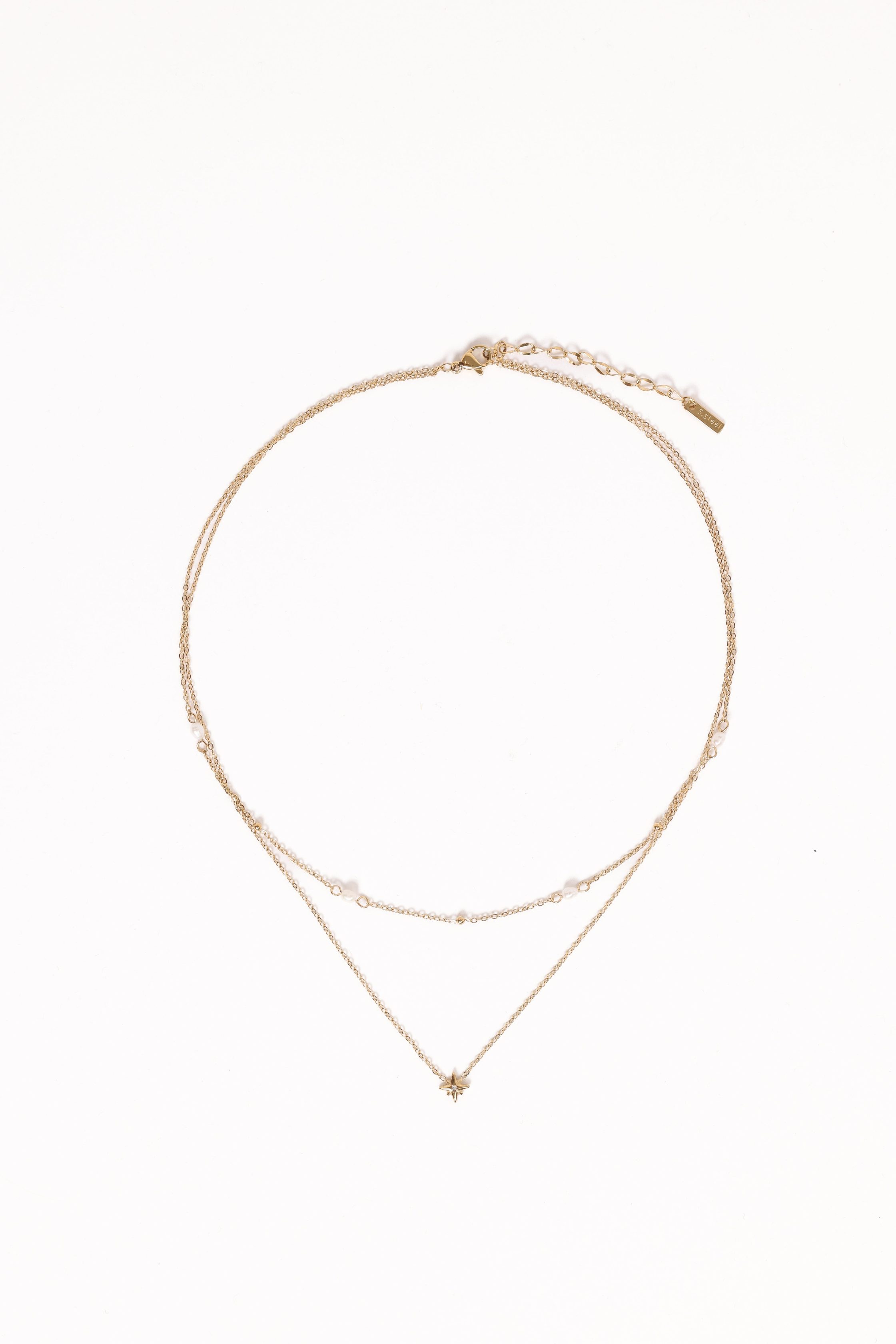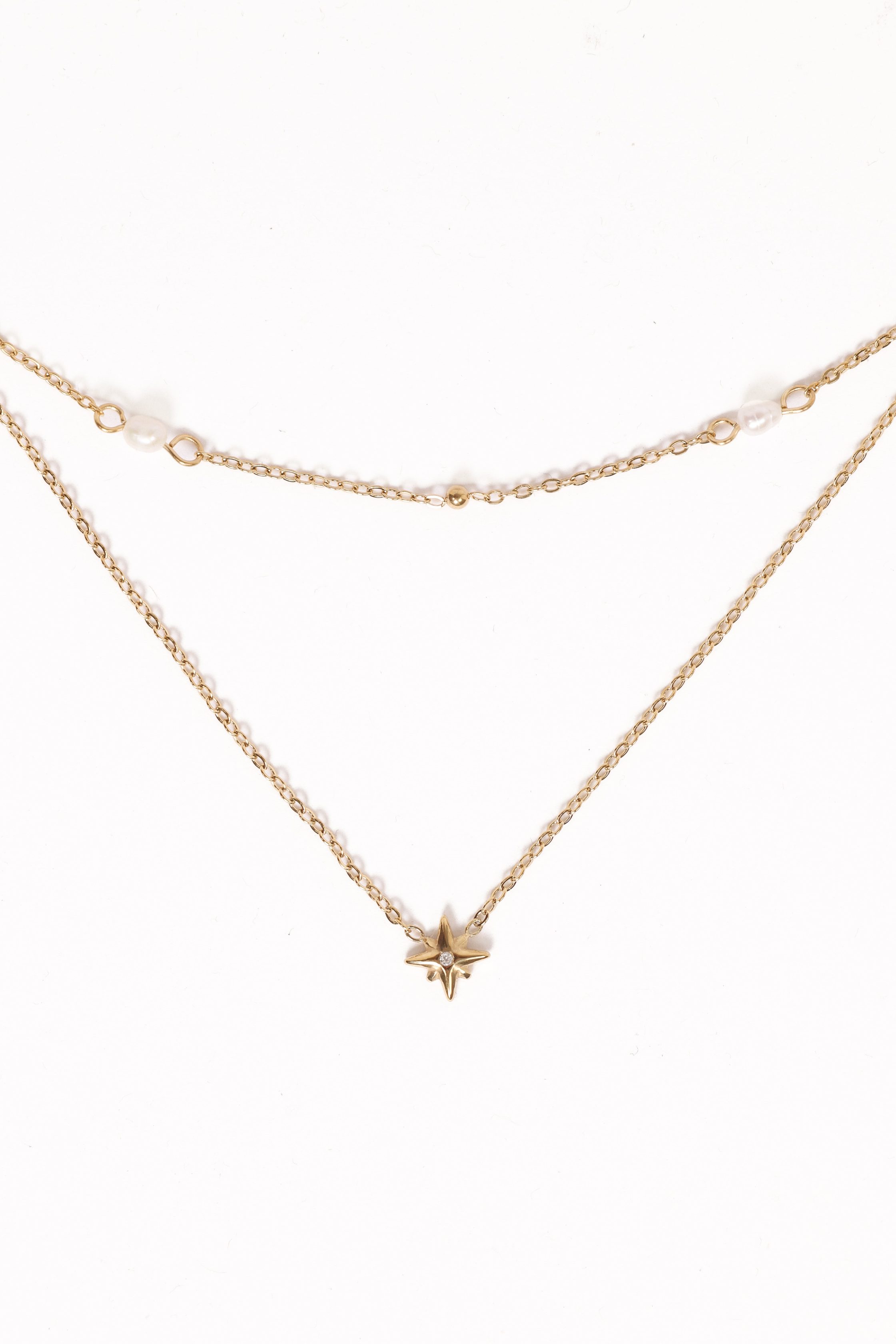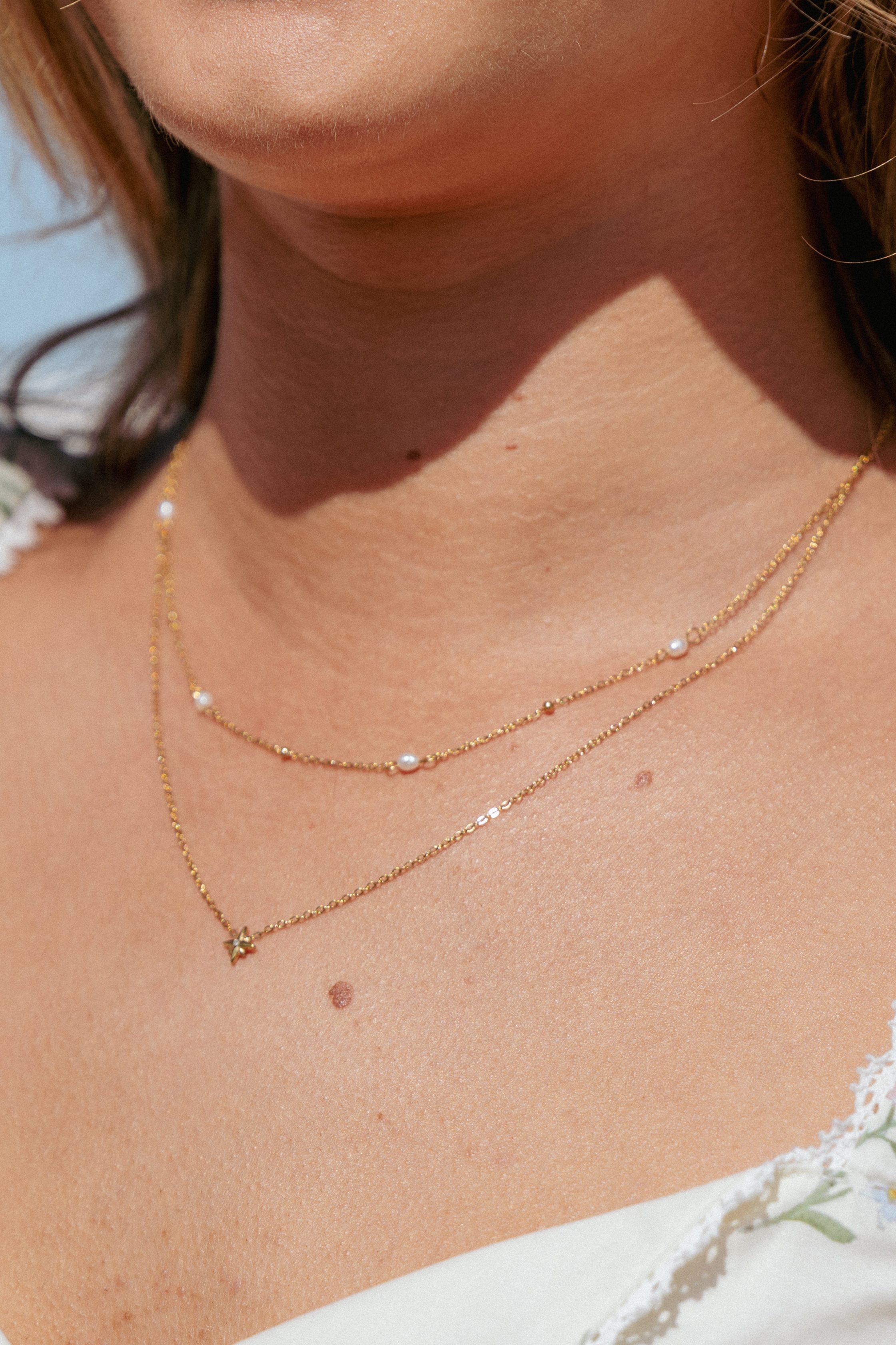 DETAILS Add a touch of effortless elegance to your look with the Priscilla Necklace in Gold. This layered set of two features a delicate star pendant and a faux pearl detail, creating the perfect blend of celestial charm and timeless sophistication. layered neckline set of two faux pearl detail delicate star pendant go