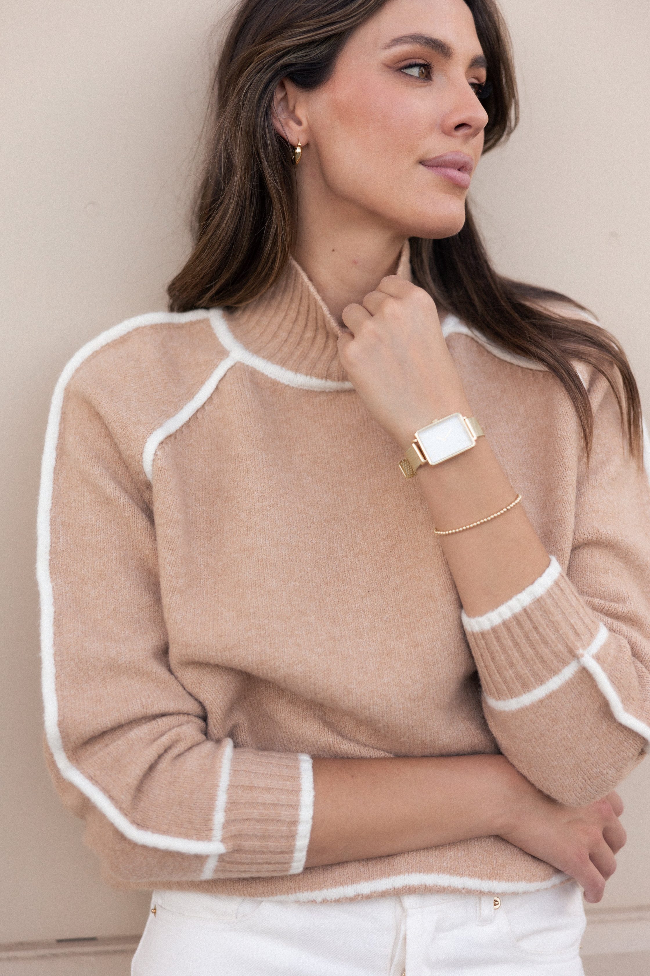 This piece features a high mockneck neckline, providing both warmth and a touch of modern chic. Carefully crafted long sleeves with ribbed cuffs offer a snug fit, ensuring comfort as you transition effortlessly through the seasons. With its striking white contrast trim detail, every angle offers a visual delight. high mockneck neckline long sleeves with ribbed cuffs white contrast trim detail ribbed hemline unlined material – 65% acrylic / 35% wool SIZING studio model is 5' 7" and wears a size S/M model stats: bust – 33", waist – 26", hips – 38" GARMENT CARE cold hand wash separately