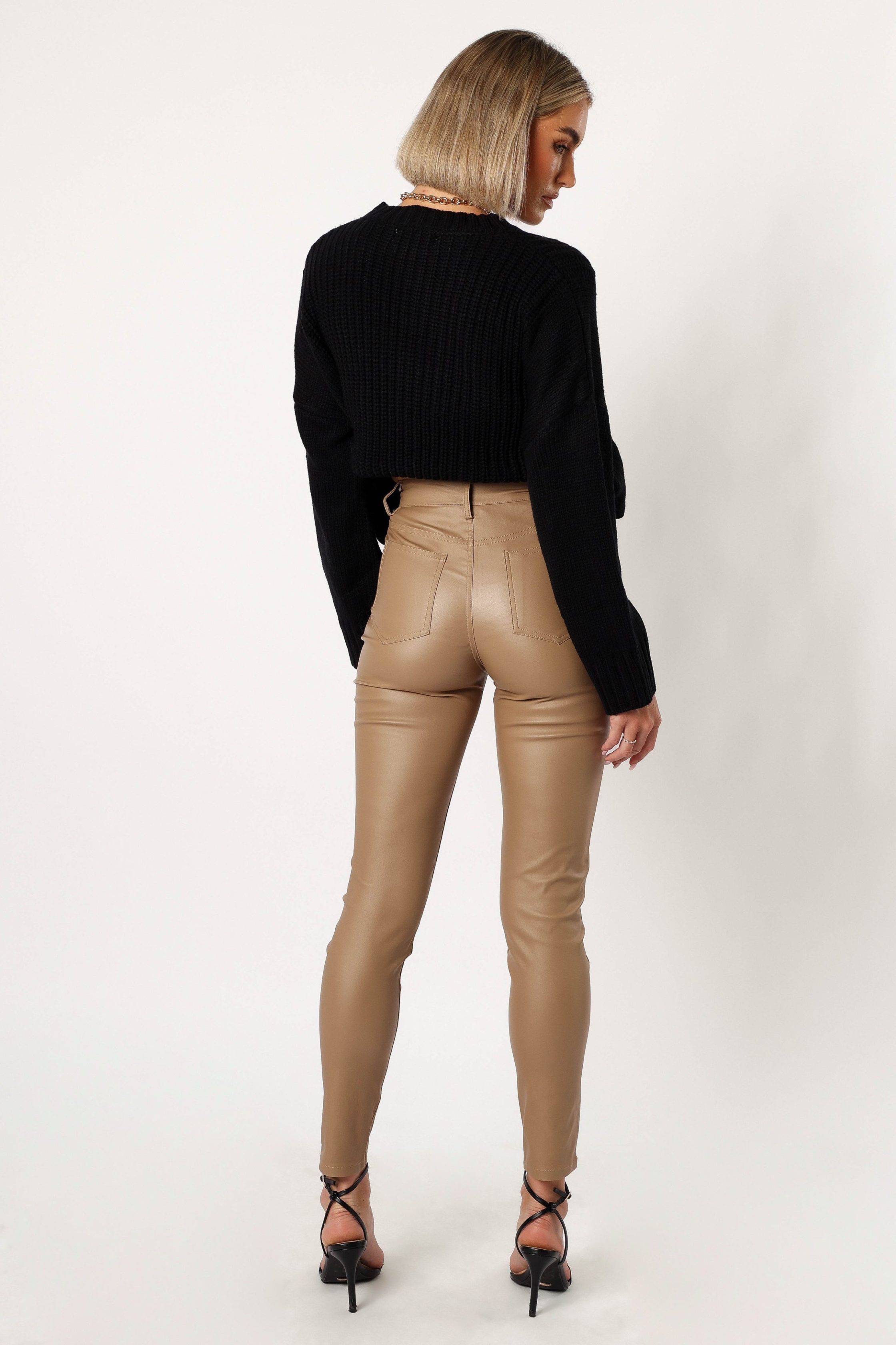 The zipper fly with button close adds a touch of edginess to these pants, perfect for those who like to stay ahead of the fashion curve. The belt loops and functional front and back pockets make these pants practical for everyday wear, while still maintaining a cool and trendy vibe. vegan leather pants slim fit style zipper fly with button close belt loops functional front and back pockets unlined material – 77% rayon / 20% nylon / 3% elastane SIZING model is 5' 10" and wears a Size 2 model stats: bust – 35", waist – 26.5", hips – 37.5" GARMENT CARE cold hand wash separately