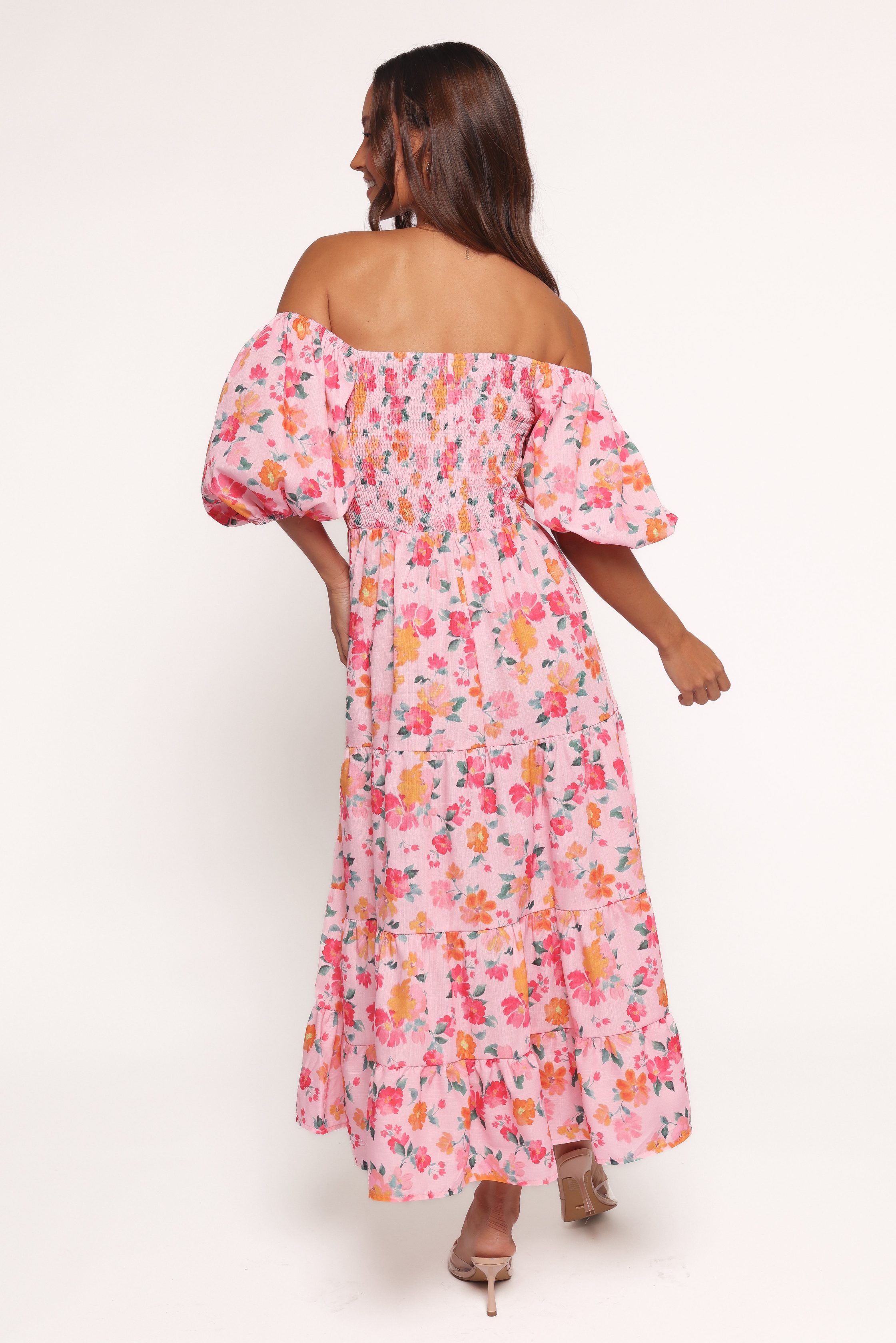 DETAILS This season, let your style shine in our classic Soliel dress. With a square neckline adorned with short sleeves and elasticised cuffs, it's comfortable and stylish all at once. For an added touch of detail, the shirred elasticised bodice and drop tier skirt design make for an effortless silhouette. midi length