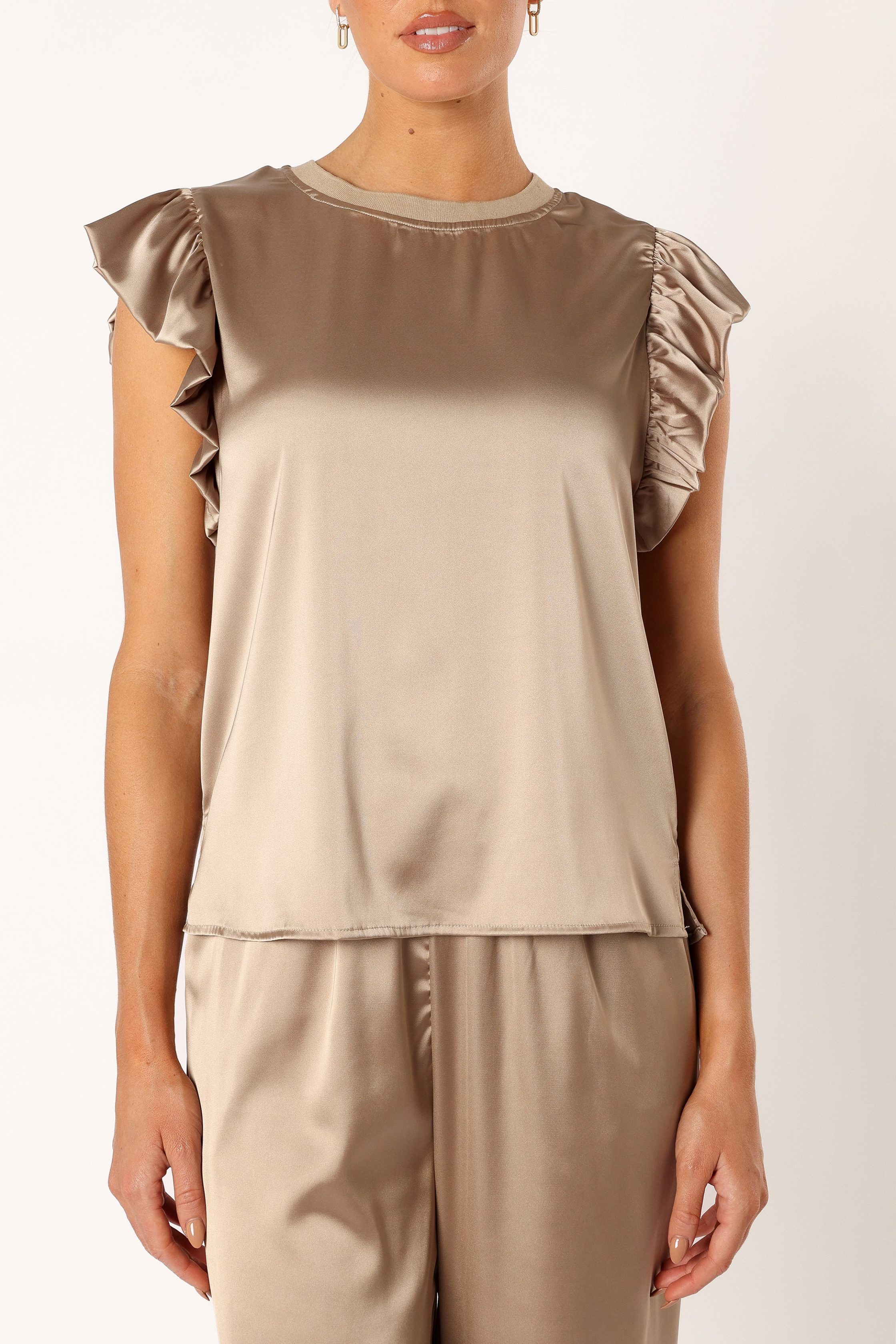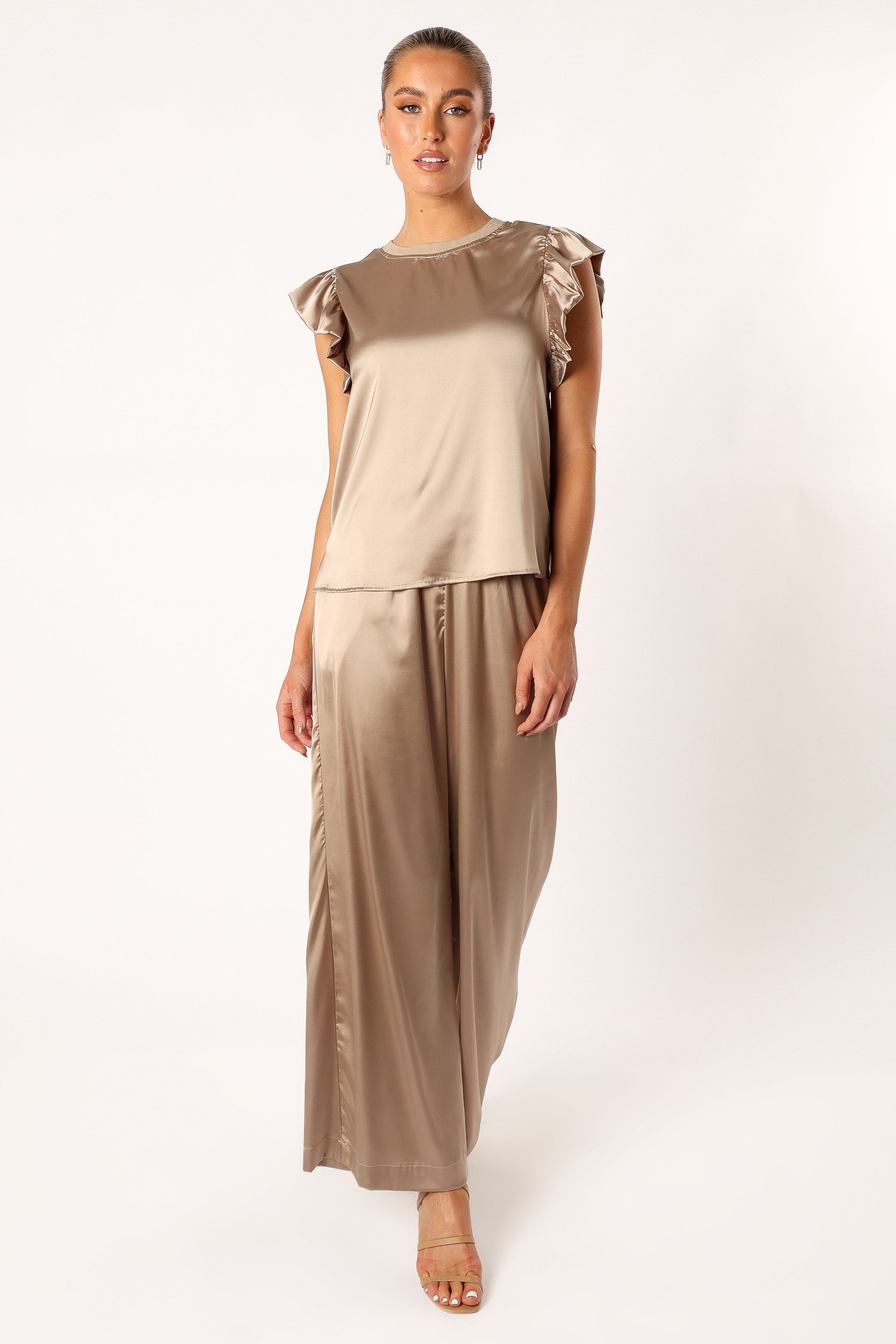 The high round neckline of the top adds a touch of sophistication, while the short frill sleeves give it a playful and unique look. The high waisted style pants are not only on-trend but also incredibly flattering. The elasticised waistband provides ultimate comfort, allowing you to move freely without feeling restricted. top and pant set high round neckline short frill sleeves high waisted style pants elasticised waist band functional pockets relaxed leg style soft satin feel unlined material – 95% polyester / 5% spandex SIZING model is 5' 10" and wears a Size S model stats: bust – 35", waist – 26.5", hips – 37.5" GARMENT CARE cold hand wash separately