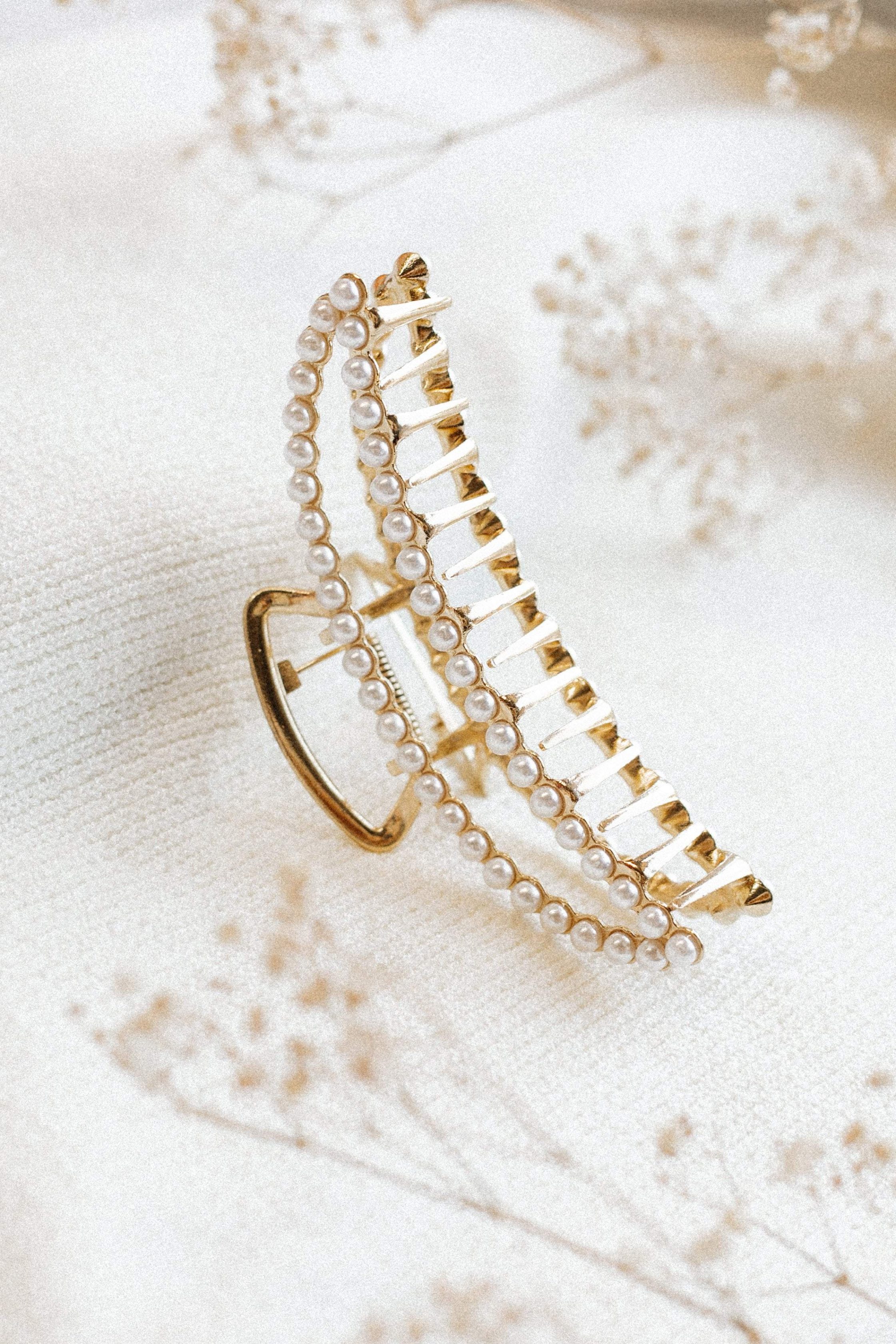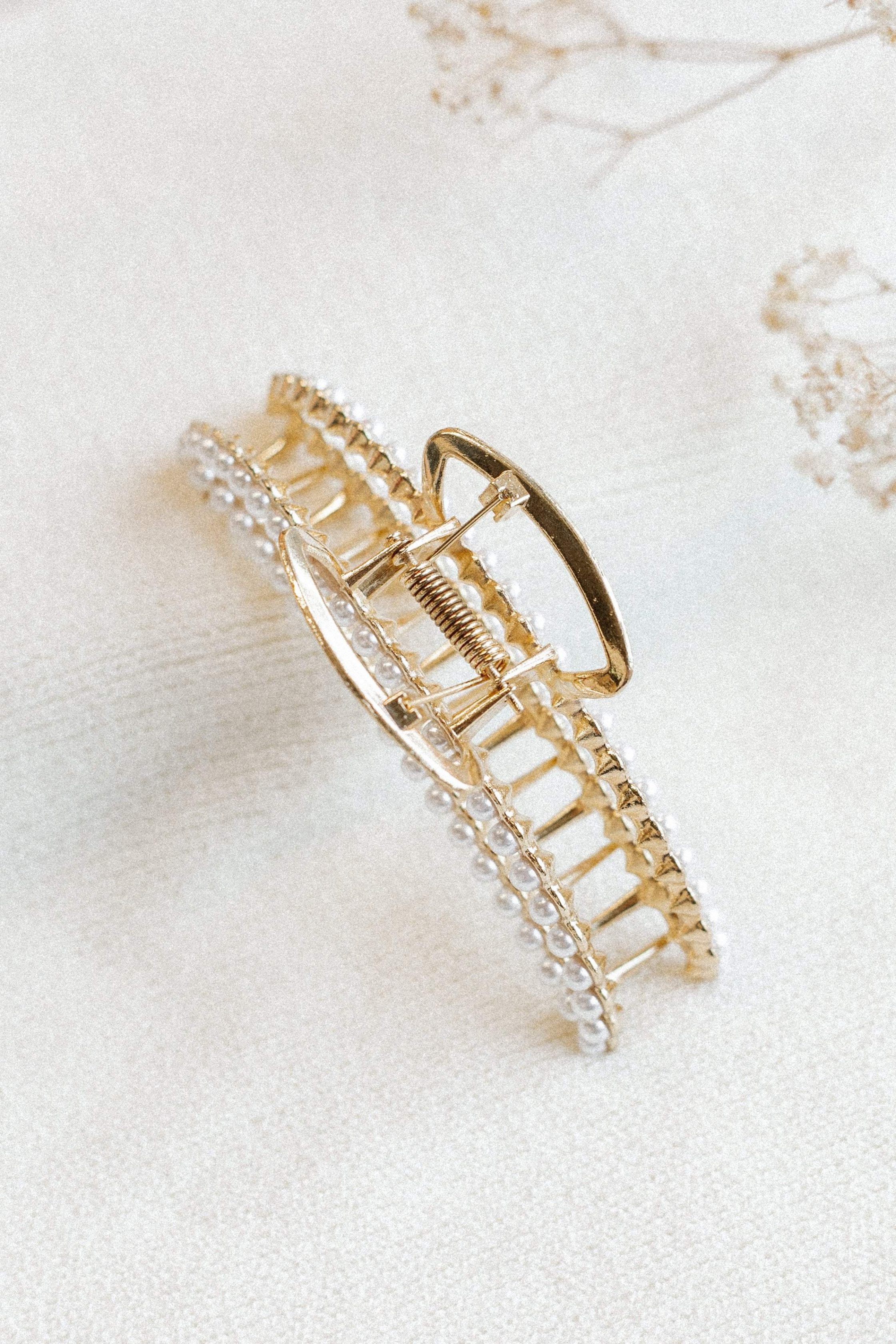 Are you looking for the perfect finishing touch for your outfit? Look no further than this chic and stylish hair clip! With its claw style, gold colour and pearl detail, this stunning accessory will add a touch of glamour to any look. claw style clip pearl detail gold color metal clasp and teeth LENGTH length – 4.5"