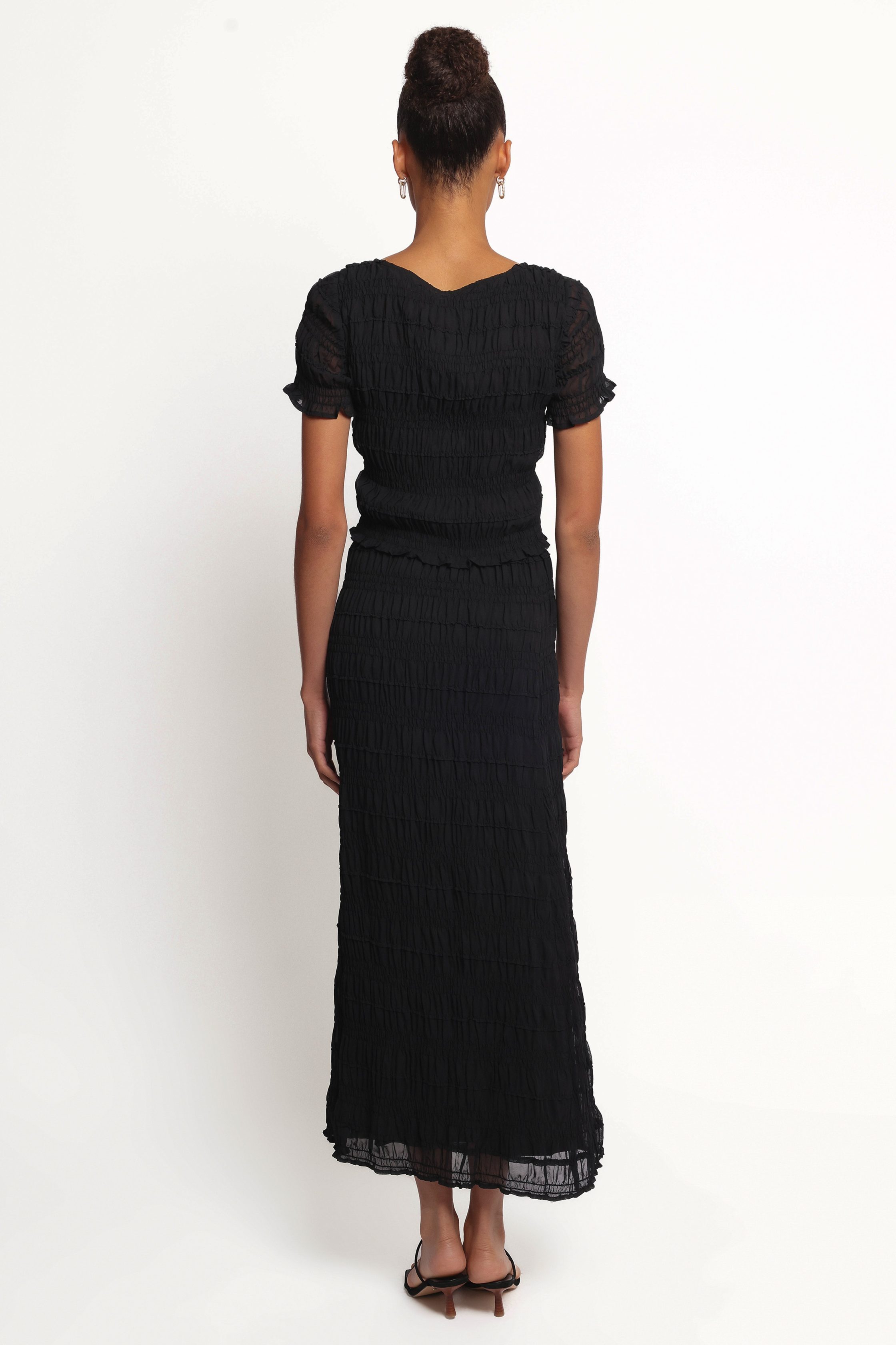 DETAILS The Valana Skirt is where style meets everyday versatility. With its flowing maxi length and an elasticised waistband that ensures a perfect fit, this skirt combines comfort and style effortlessly. midi length elasticised waist band shirred textured fabrication lined – 100% polyester material – 100% polyester S