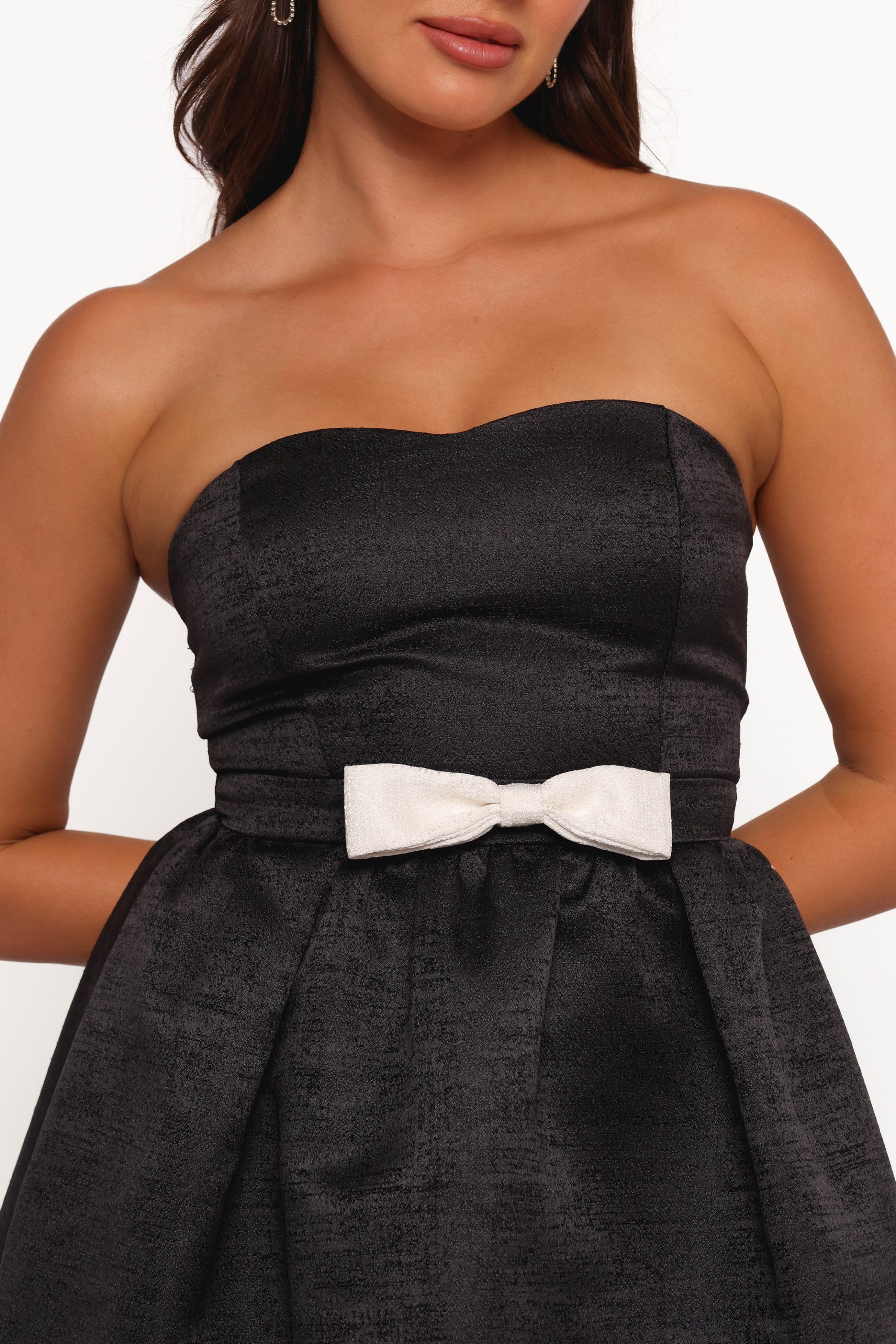 Are you looking for the perfect mini dress? Look no further – we've got you covered! With its straight neckline and thin tie close straps, this mini dress is sure to turn heads. mini length strapless style sweetheart neckline inner bust rubber grip back invisible zip with hook and eye clasp white bow detail lined material – 100% polyester lining – 95% polyester / 5% spandex SIZING studio model is 5' 7" and wears a Size S model stats: bust – 33", waist – 27", hips – 36" GARMENT CARE cold hand wash separately