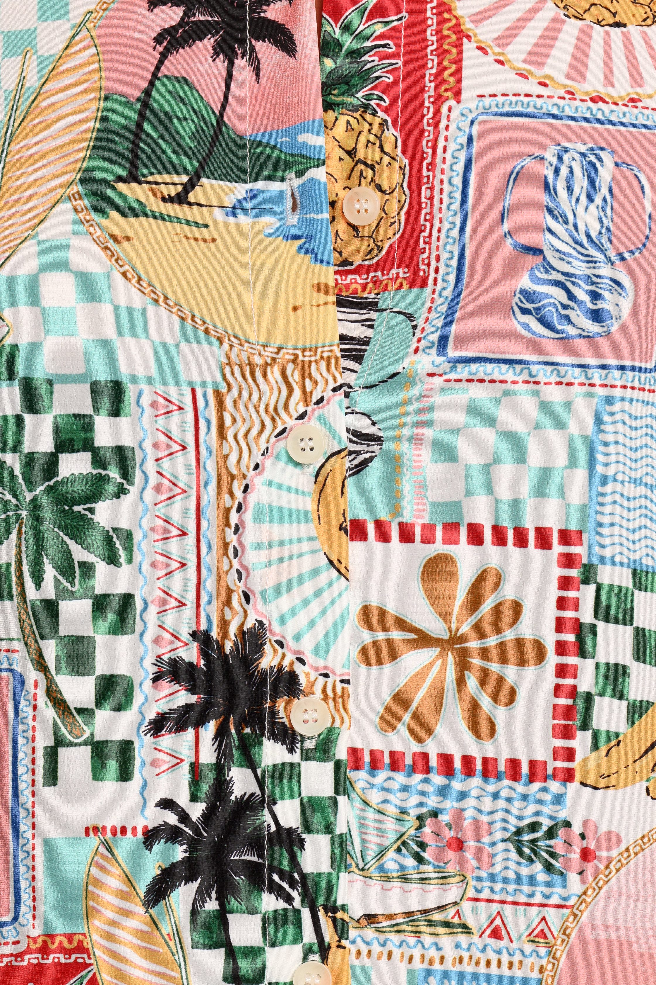 DETAILS Bring a touch of paradise to your wardrobe with the Valeria Shirt in Off White Multi. Designed with a tropical-inspired print that evokes breezy island vibes, this cropped shirt effortlessly blends style and comfort. cropped length spread collar v neckline short sleeves functional buttons down front tropical in
