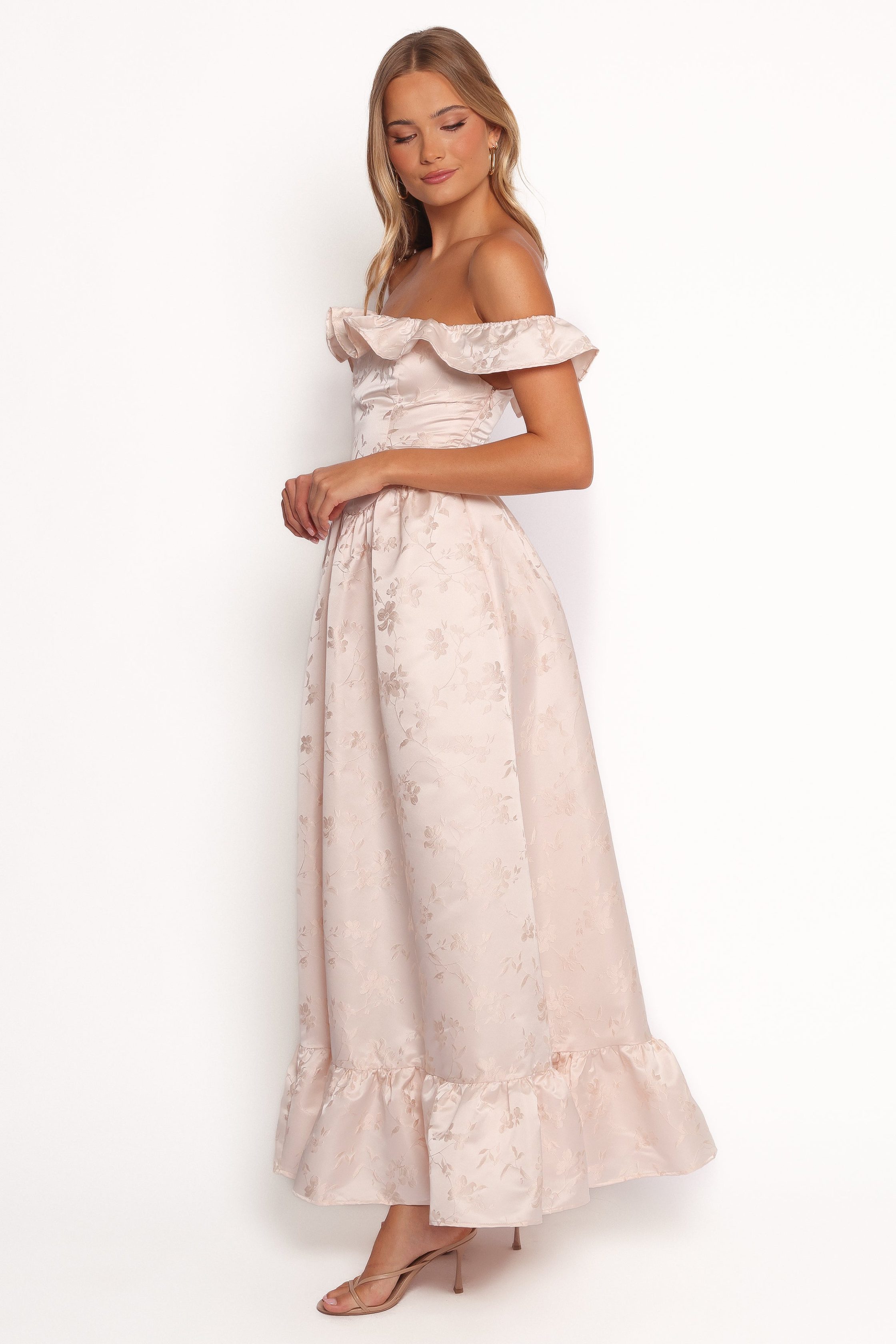DETAILS Turn heads and exude effortless elegance in the Vivien Maxi Dress – Pink. Featuring a chic off-shoulder style and a maxi length that flows beautifully, this dress is the perfect blend of romantic charm and modern design. off shoulder style maxi length elasticised straight ruffle neckline back elasticised shirre