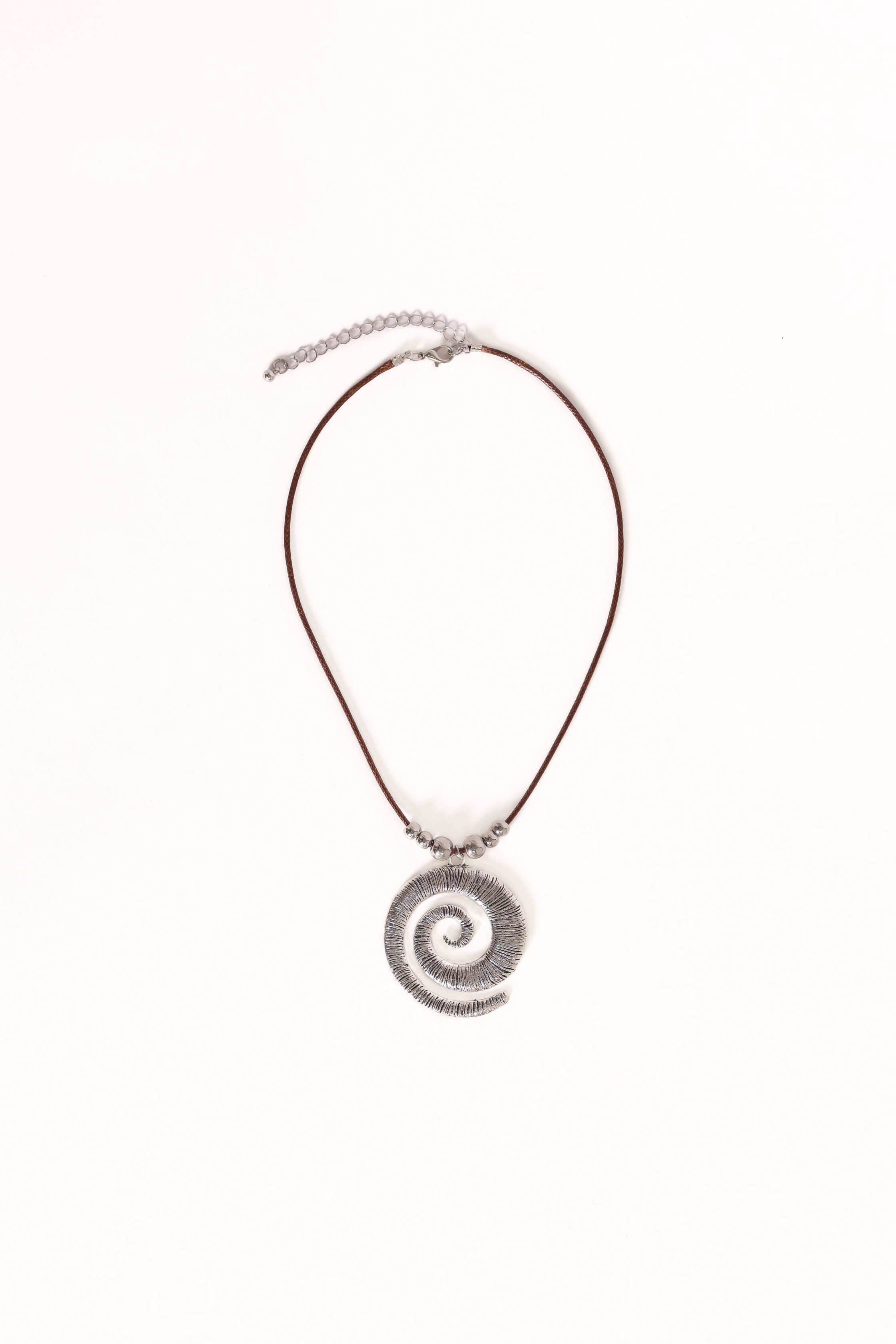 DETAILS Add a touch of effortless elegance to your look with the Whisper Necklace in Silver. Featuring a bold, large silver spiral pendant on a chic brown cord chain, it strikes the perfect balance between modern artistry and timeless design. brown cord chain large silver spiral pendant lobster clasp close material – 9