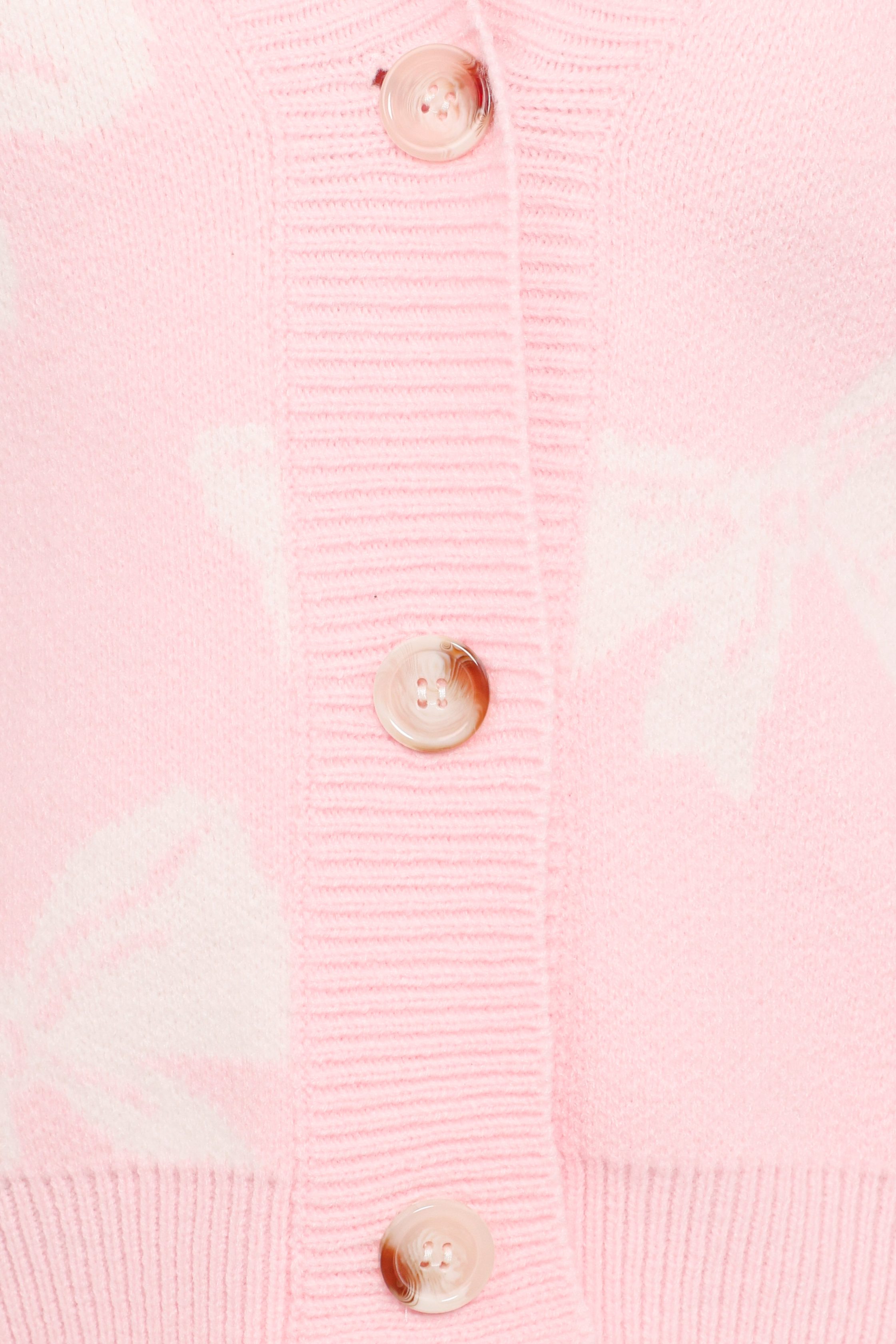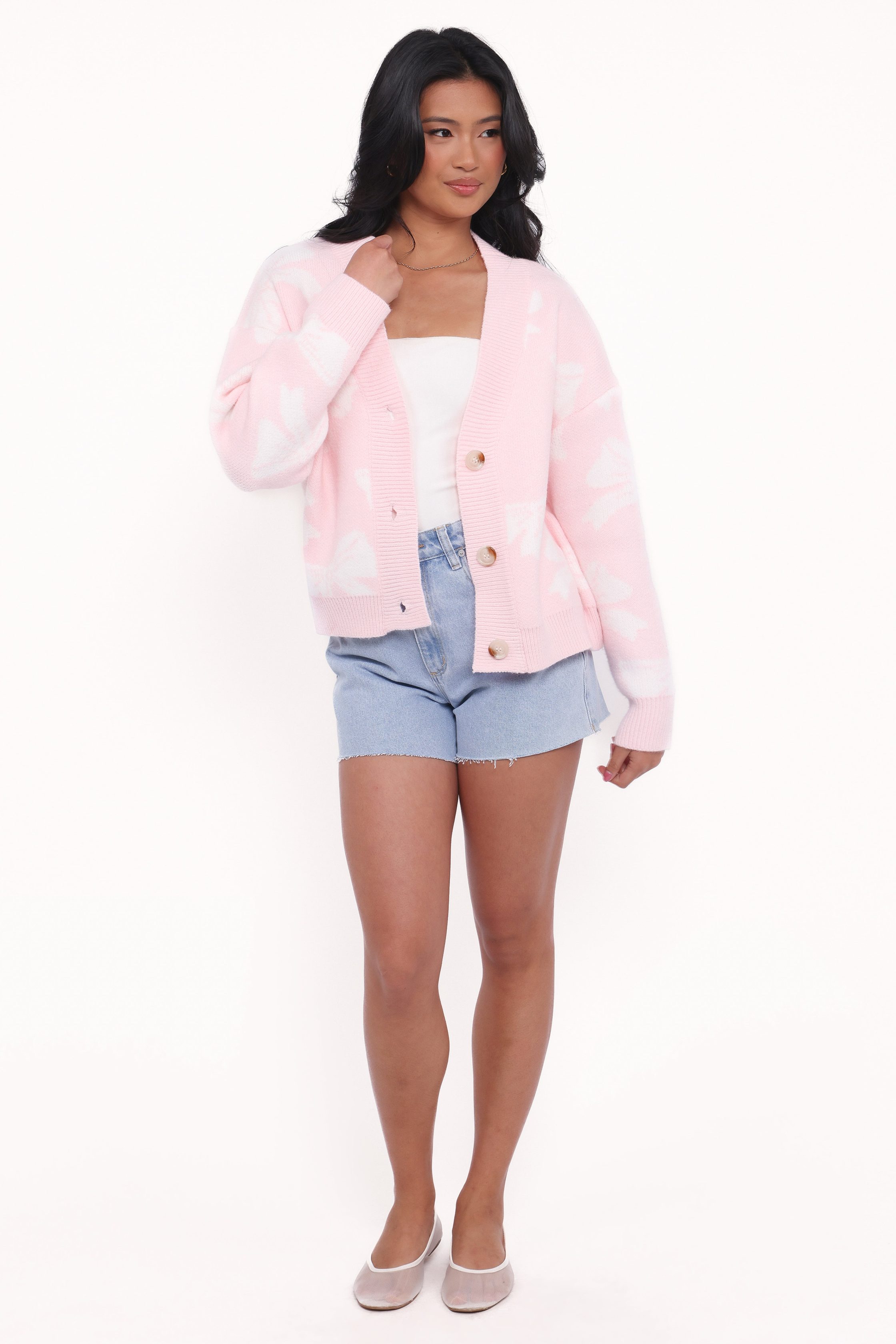 DETAILS Wrap yourself in cozy elegance with the Wrenn Bow Knit Cardigan in Soft Pink. This charming piece features a chic v neckline and long sleeves that provide effortless layering options for cooler days. v neckline long sleeves functional buttons down front white bow design ribbed trim and hemline unlined material
