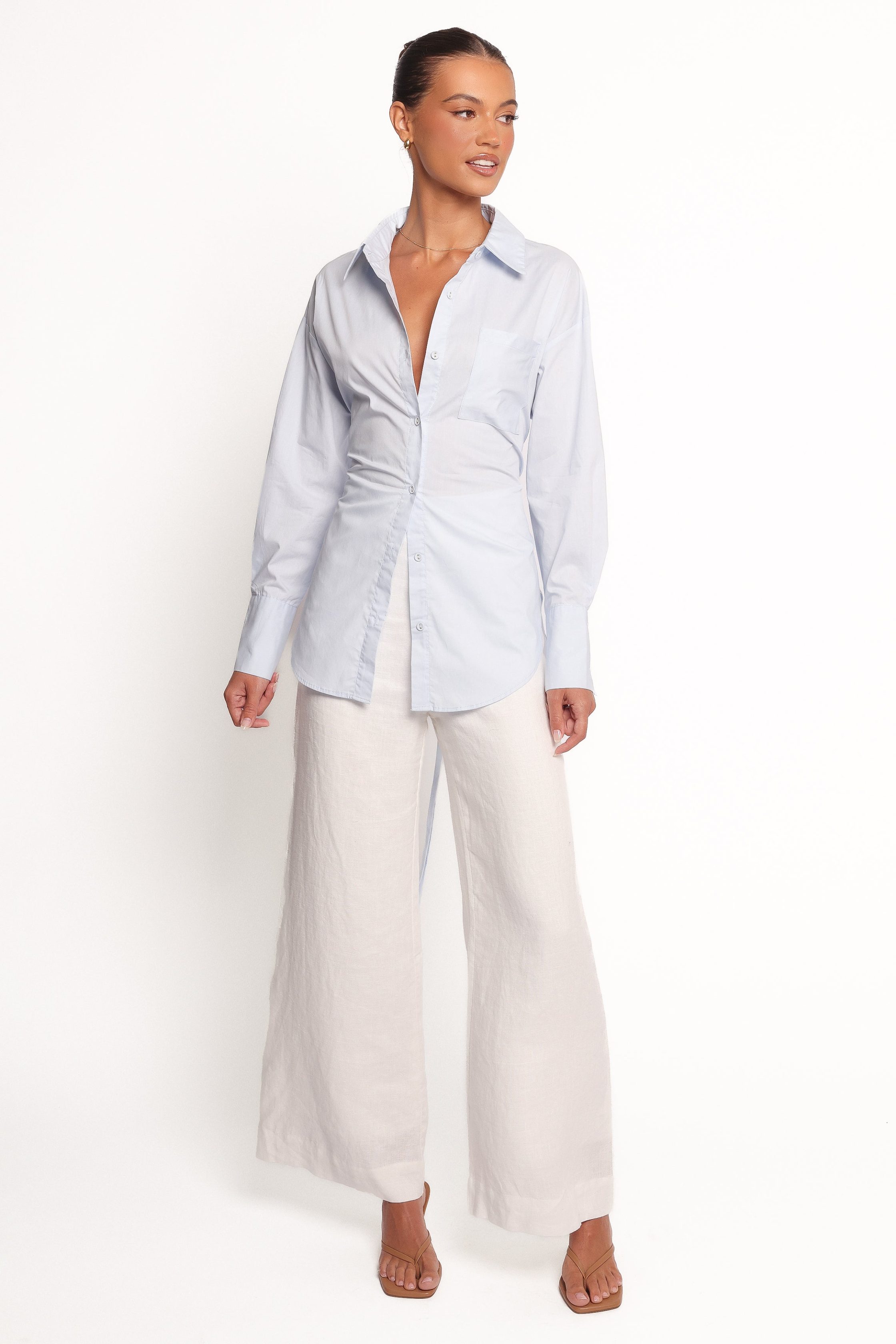 DETAILS The Yacra Tie Shirt in Pale Blue is your everyday essential with a chic twist. Its classic collared design, button-down front, and long sleeves exude effortless sophistication, while the functional back tie adds a refreshing modern edge. With a handy bust pocket for practicality, this versatile blouse blends st