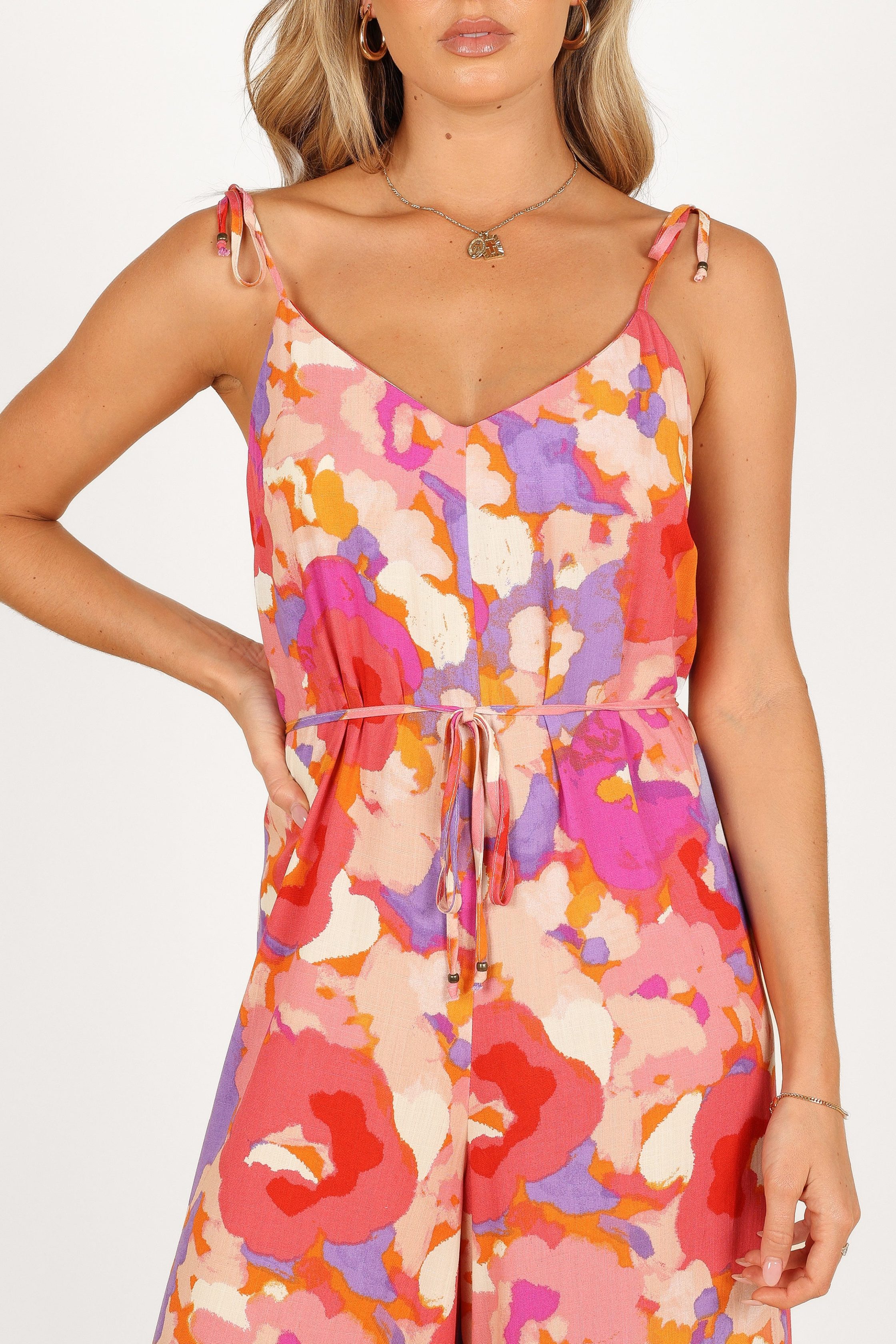 This jumpsuit is sure to make you look fabulous! With its v neckline, thin tie close straps, back invisible zip with hook and eye clasp, belt loops and detachable waist tie – it's perfect for spring with a stunning floral print. v neckline thin tie close straps back invisible zip with hook and eye clasp belt loops detachable waist tie wide leg style pant abstract floral print unlined material – 100% rayon SIZING model is 5' 10" and wears a Size S model stats: bust – 35", waist – 26.5", hips – 37.5" GARMENT CARE cold hand wash separately