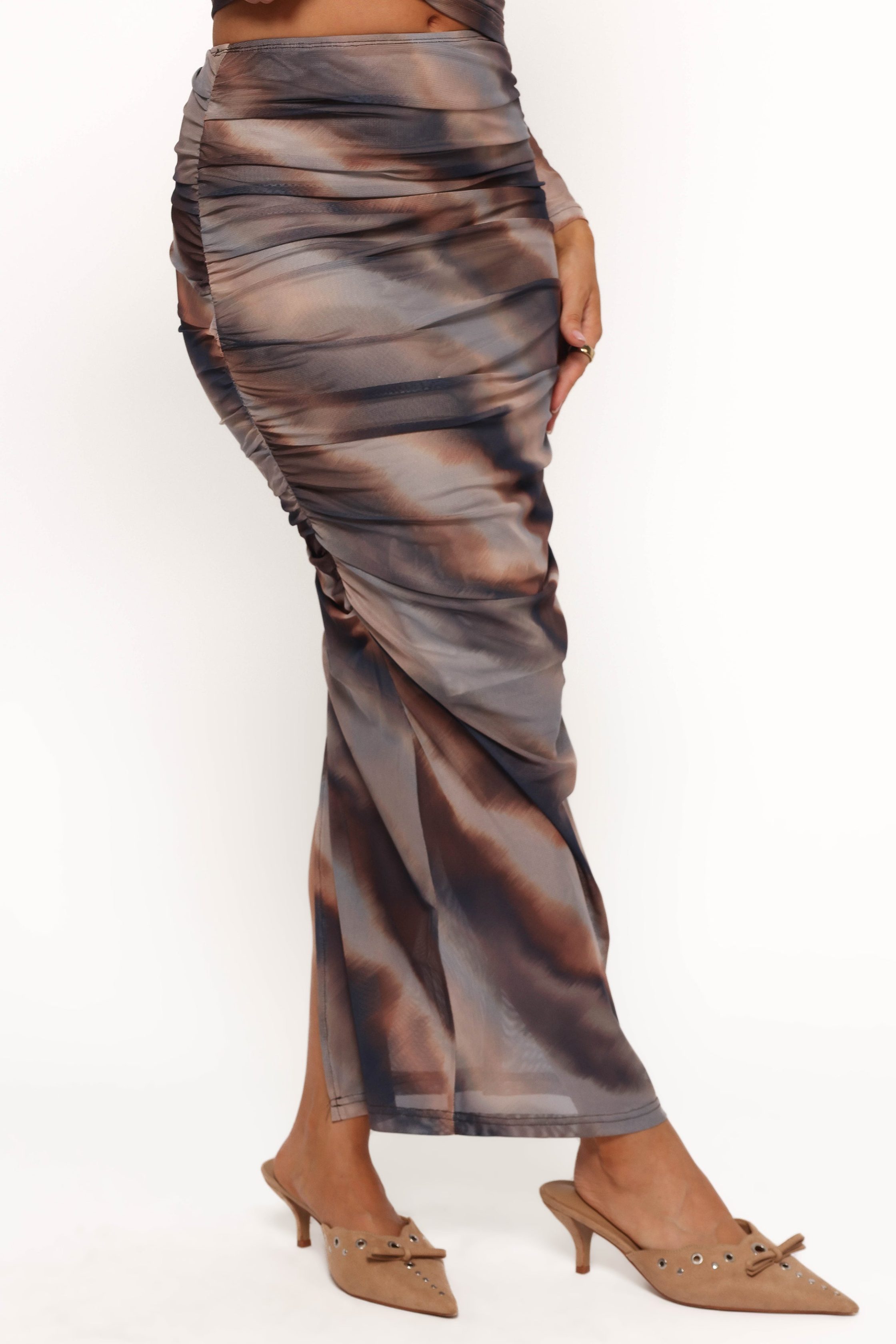 Picture this: You’re getting ready for a night out or a casual brunch, and you slip into a skirt that not only looks amazing but feels incredibly comfortable. The high-waisted style elongates your silhouette, making you look taller and more graceful with minimal effort. maxi length elasticised waist high waisted style ruched side design back split detail ombre print feature mesh overlay pull on design partially lined material – 95% polyester / 5% elastane SIZING studio model is 5' 5" and wears a Size XS model stats: bust – 31.5", waist – 25.5", hips – 37" GARMENT CARE cold hand wash separately