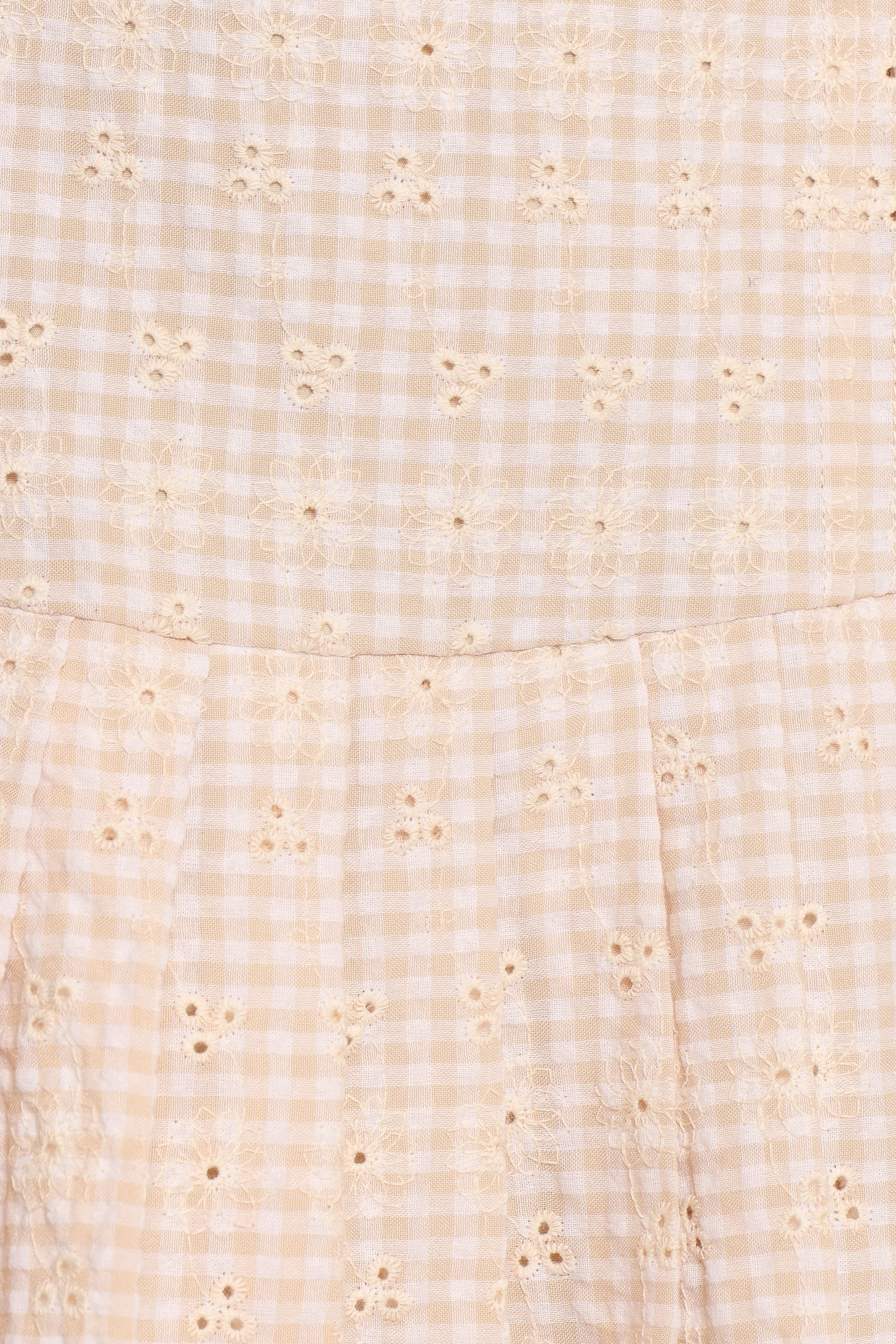 DETAILS Effortlessly elevate your wardrobe with the Zephyra Mini Dress in Cream. This chic piece combines timeless beige gingham with delicate embroidery anglaise fabrication for a look that's equal parts modern and classic.  mini length square neckline wide adjustable straps pleated skirt design belt loop and detachab