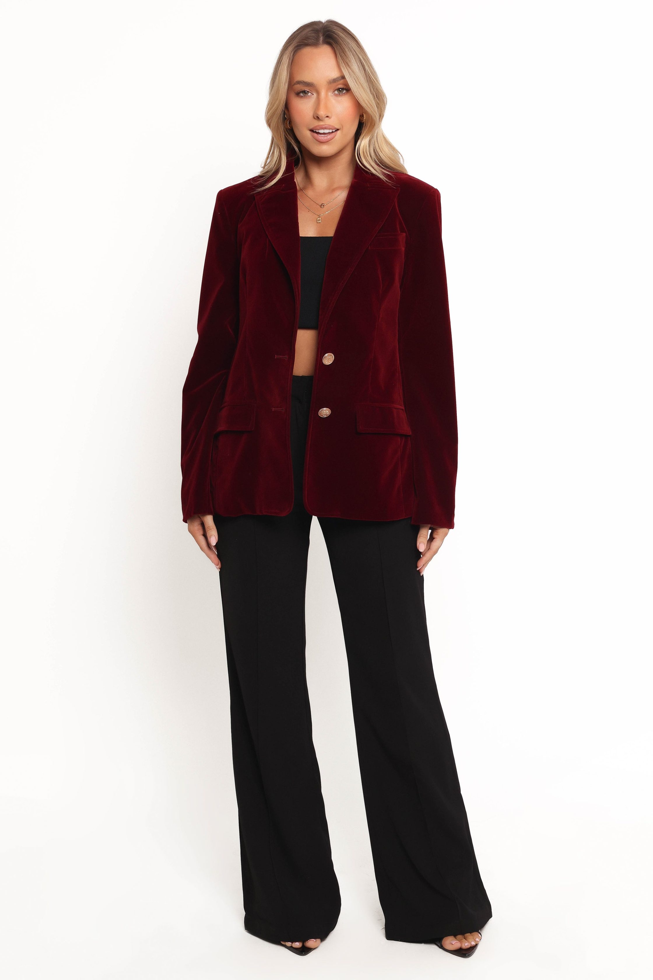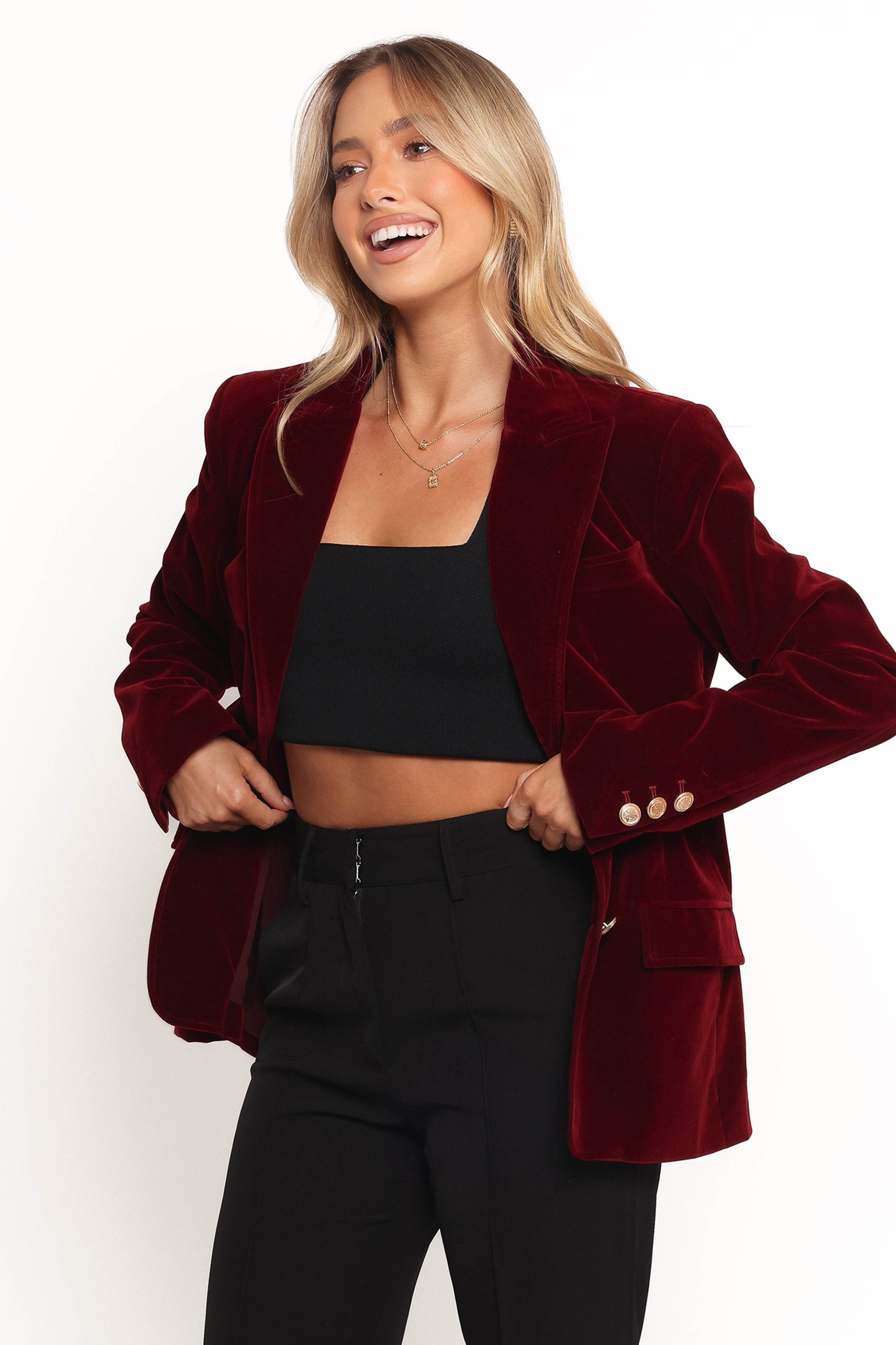 Elevate your wardrobe with the Zpya Single Button Velvet Blazer in a deep berry hue. This fashion-forward piece exudes elegance with its plush velvet texture and sophisticated rose gold button details. The blazer's v-neck design and front button closure create a flattering silhouette, making it a versatile addition to any outfit. v neck front button close long sleeves functional front pockets rose gold button details velvet feel design lined material – 100% polyester / lining – 95% polyester / 5% spandex SIZING studio model is 5' 5" and wears a Size S model stats: bust – 31.5", waist – 25.5", hips – 36" GARMENT CARE cold hand wash separately